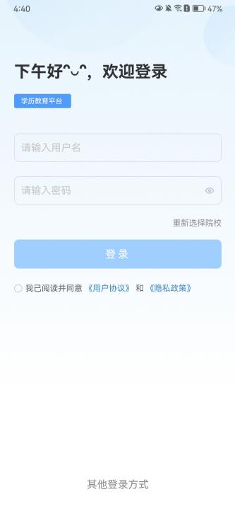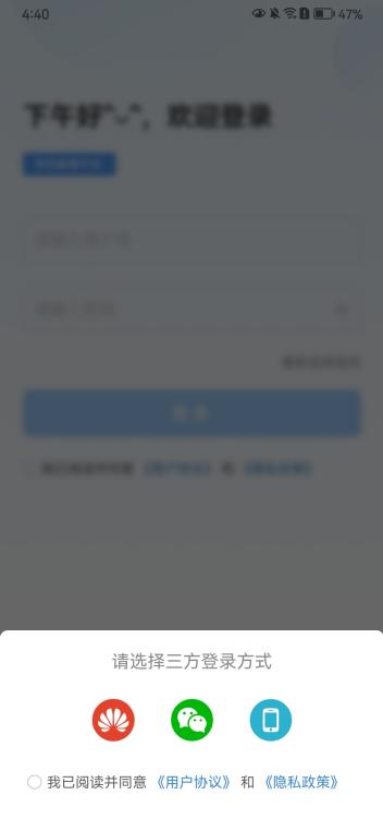 (3)学员登录:输入用户名和密码,查看并勾选《用户协议》和《隐私协议》,点击登录,进入首页。用户名为学员学号,密码默认为学员身份证后六位;
