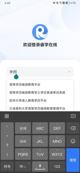 (1)点击睿学在线App图标,启动App,进入院校选择页