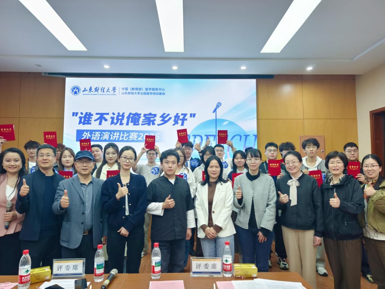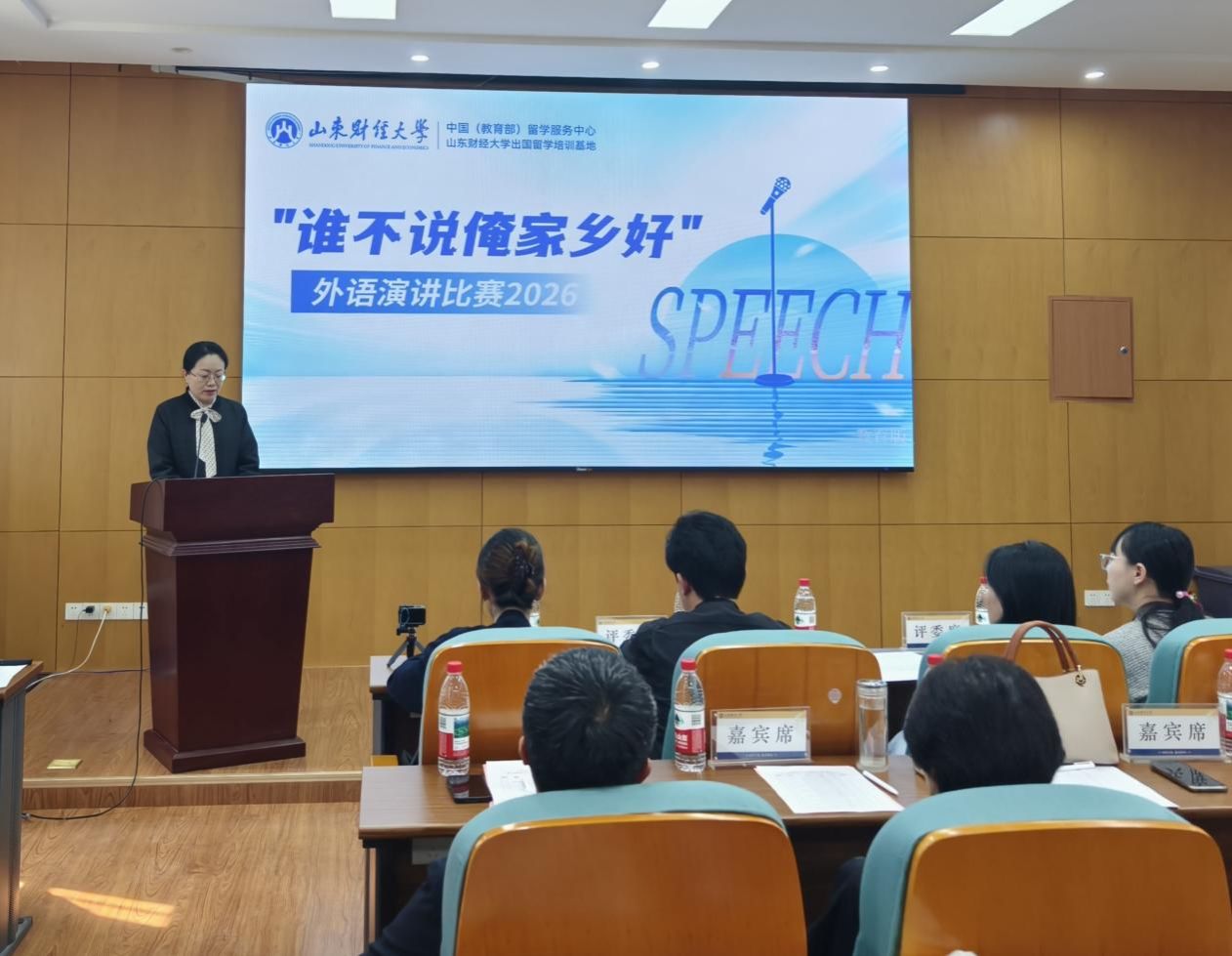 4月1日下午,山东财经大学出国留学培训基地主办的2026年“谁不说俺家乡好”外语演讲比赛在舜耕校区顺利举行。继续教育学院党委书记李焱出席活动并致辞,党委副书记范瑞雪到场参加,比赛由出国留学培训基地任课教师姜铭主持。
