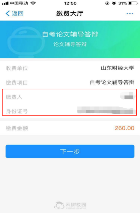 2.扫码后会出现以下界面,请各位考生按要求填写相关信息(缴费人员的身份证号、准考证号、专业和姓名)。填写好相关信息后,点击下一步。