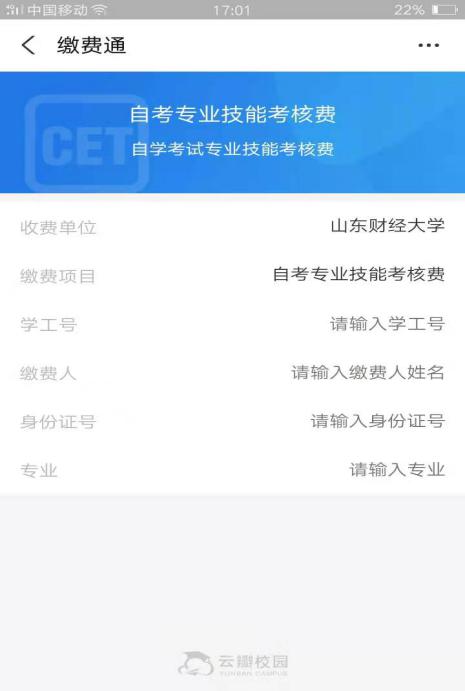 2.在扫码后出现的下面界面中按要求填写相关信息:在“学工号”中输入准考证号,然后依次输入姓名、身份证号。填写好相关信息后,点击下一步(如信息填写有误,则无法缴费)。