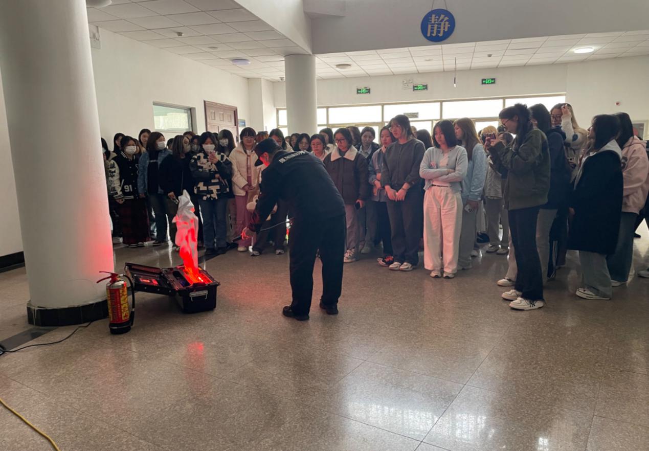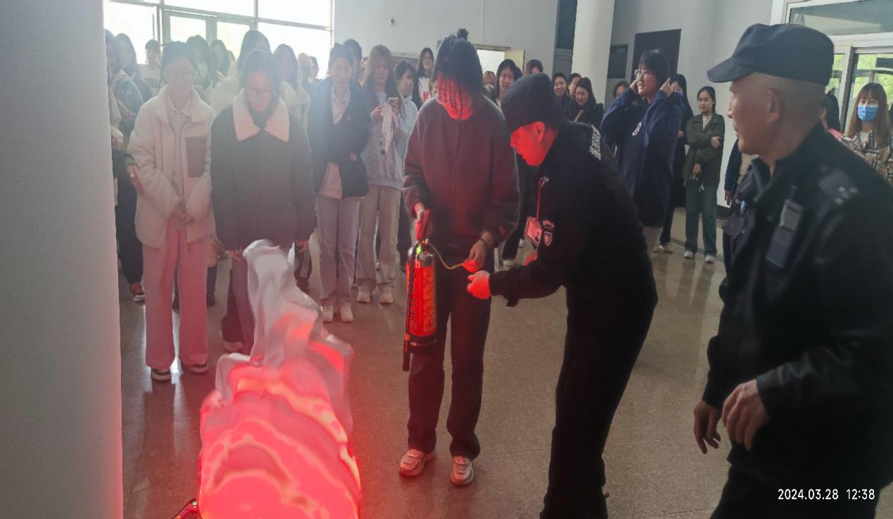 在灭火器使用培训环节,学校安全管理处老师为学生们讲解了消防安全知识、灭火器的种类以及适用范围等基本知识,重点讲解了手提式干粉灭火器的操作要领和注意事项,并现场演示了正确使用方法,同时,指导多名同学轮流现场操作。